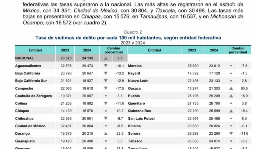La ENVIPE, destaca el lugar que ocupó Tamaulipas en el ranking nacional en 2024, con una tasa de víctimas de delito de 16,537 por cada 100 mil habitantes, por abajo del promedio nacional de 24,135 víctimas, que representa una disminución de 8.7% respecto a la tasa registrada en el año de 2023, y lejos de las tasas más altas registradas en 2024, de 34 851, 30 804 y 30 498, que ocuparon los primeros tres lugares.