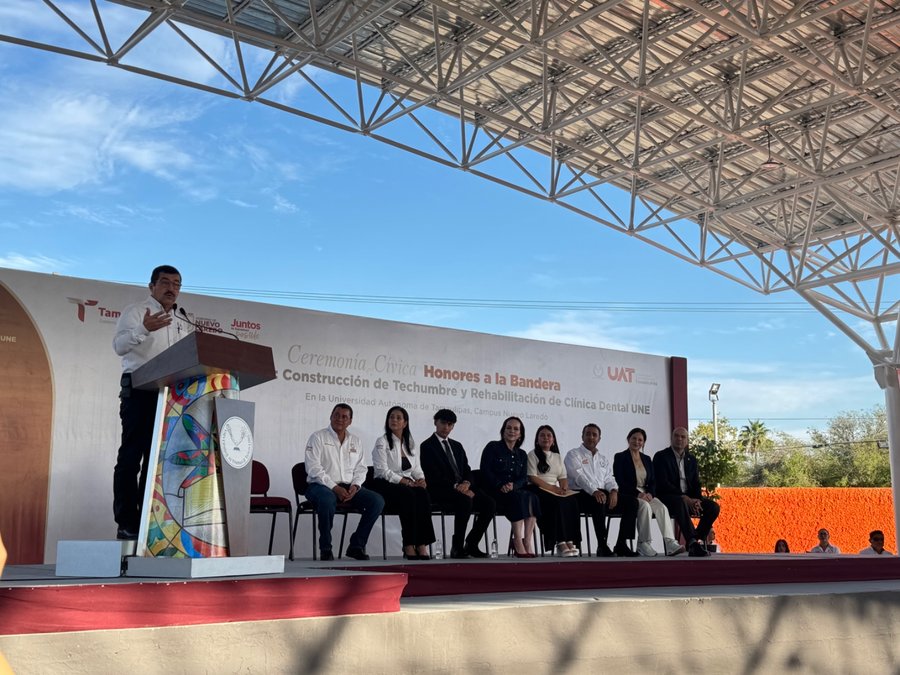El rector de la Universidad Autónoma de Tamaulipas (UAT), Dámaso Anaya Alvarado, encabezó, junto a la presidenta municipal de Nuevo Laredo, Carmen Lilia Canturosas Villarreal, la ceremonia cívica de honores a la bandera y la entrega de la nueva techumbre en la Facultad de Comercio, Administración y Ciencias Sociales de Nuevo Laredo.