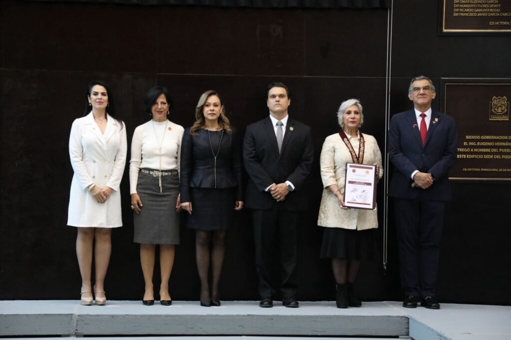 Durante la sesión solemne realizada este lunes 1 de diciembre, el Diputado Presidente de la JUGOB, Humberto Prieto Herrera, junto al Gobernador del estado de Tamaulipas, Américo Villarreal Anaya, realizó la entrega de la Medalla al Mérito “Luis García de Arellano” y develaron el nombre de la galardonada en el muro honor.
